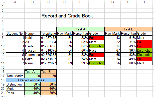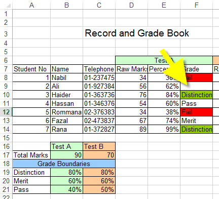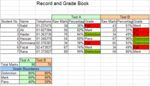 | 7. | Conditional formatting: The use of colour in mark books is a good visual aid to see the performance of the whole class and give a snapshot impression of progress made. You can use conditional formatting to make cells stand out if they meet certain criteria. For example, you may want to colour all distinction grades as green and all fail grades as red. See how » |